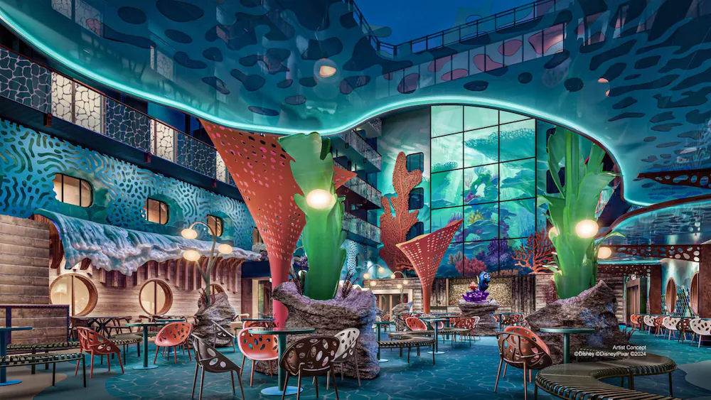 Aprecie as saborosas opções do Cosmic Kebabs. Tome um chá de bolhas terrivelmente delicioso no Bewitching Boba and Brews. E explore o arejado bar esportivo, Taverna Portorosso, e o café, Palo Café, ambos inspirados na pitoresca vila costeira italiana apresentada no filme da Pixar Luca. Essa passarela também oferece experiências gastronômicas requintadas no Palo Trattoria e no Mike and Sulley's Flavors of Asia. Tudo isso e muito mais acontece em meio a deslumbrantes recifes de corais e à suave luz do sol filtrada por coberturas de vidro. À noite, observe a área se transformar em um maravilhoso paraíso bioluminescente.