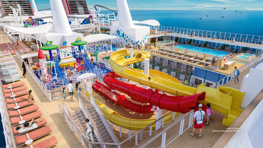 Esta área animada, que abrange o centro dos decks superiores, leva a alegria da brincadeira ao infinito e além com a Sunnyside Family Pool, os Woody and Jessie's Wild Slides, a Flying Saucer Splash Zone, o Toy Story Splash Pad e vários spas de hidromassagem. A família também pode assistir a filmes da Disney em duas telas gigantes. E quando chegar a hora de repor as energias, saboreie um lanche rápido no Pizza Planet ou um sorvete cremoso na Wheezy's Freezies.