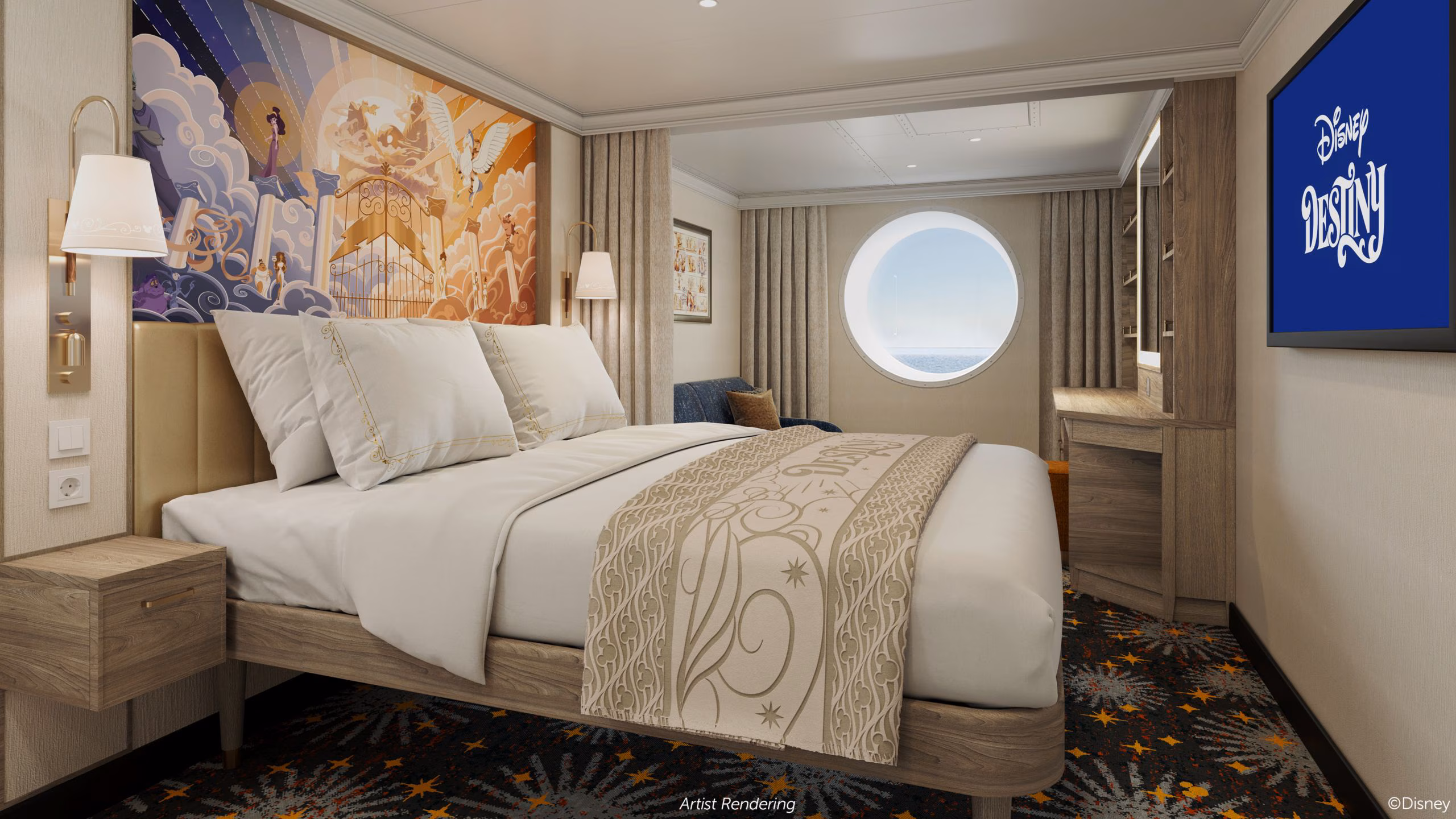 E, para a alegria das crianças, uma cena celestial com arte original de Hércules nas constelações e uma mensagem encantadora que se revela quando a cama dobrável suspensa está em uso. (Aplicável apenas para cabines que acomodam 4 hóspedes).