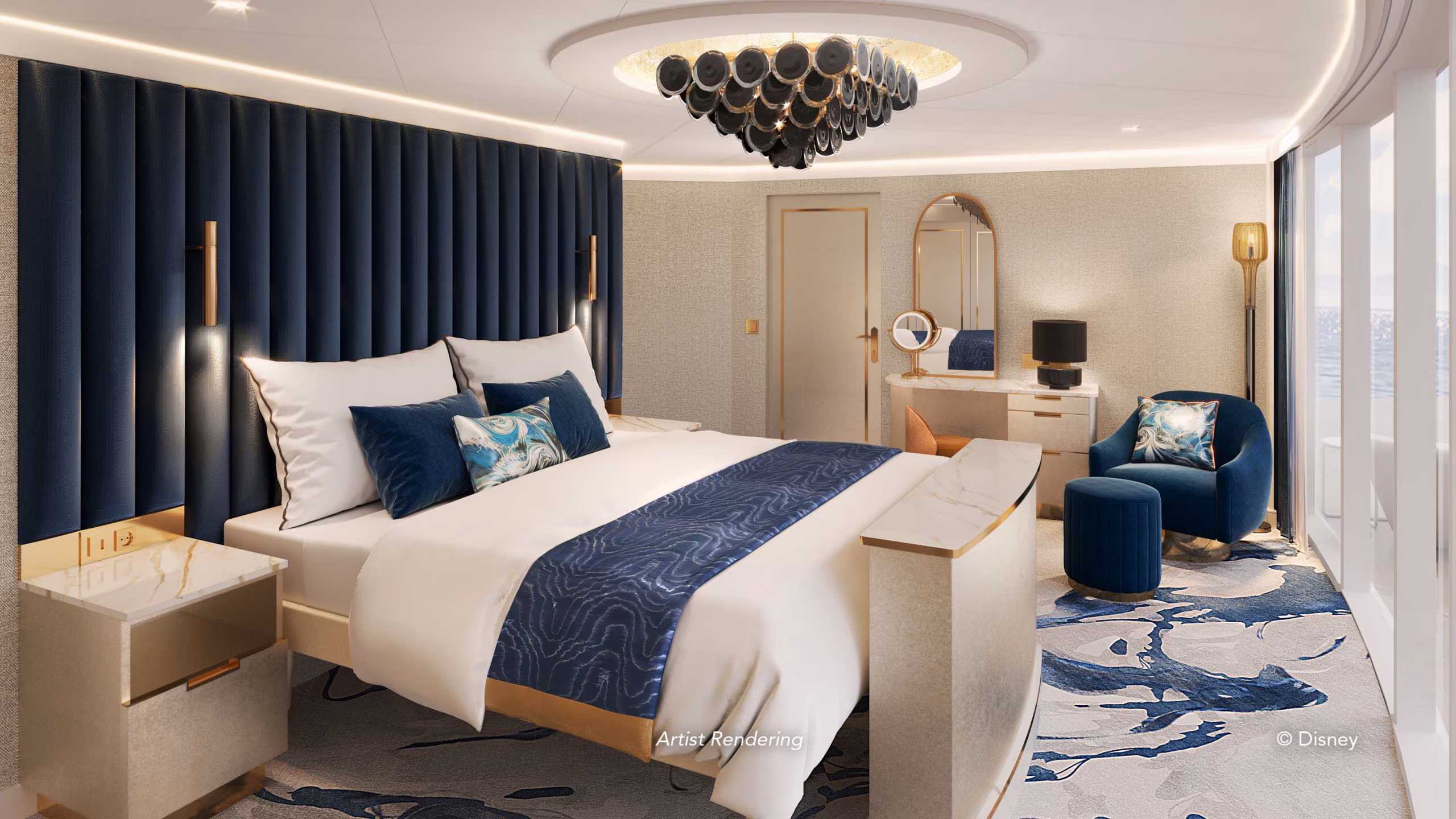 A Disney Cruise Line pensou em tudo para garantir conforto e conveniência de primeira classe durante sua viagem. Os elementos de design da suíte Concierge Royal de 1 andar, com varanda e vista para o mar incluem: