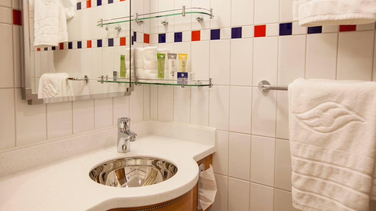 • Um “banho dividido”: um banheiro com penteadeira, pia, chuveiro e banheira e um lavabo com penteadeira, pia e vaso sanitário (em todas as cabines, exceto as acessíveis)