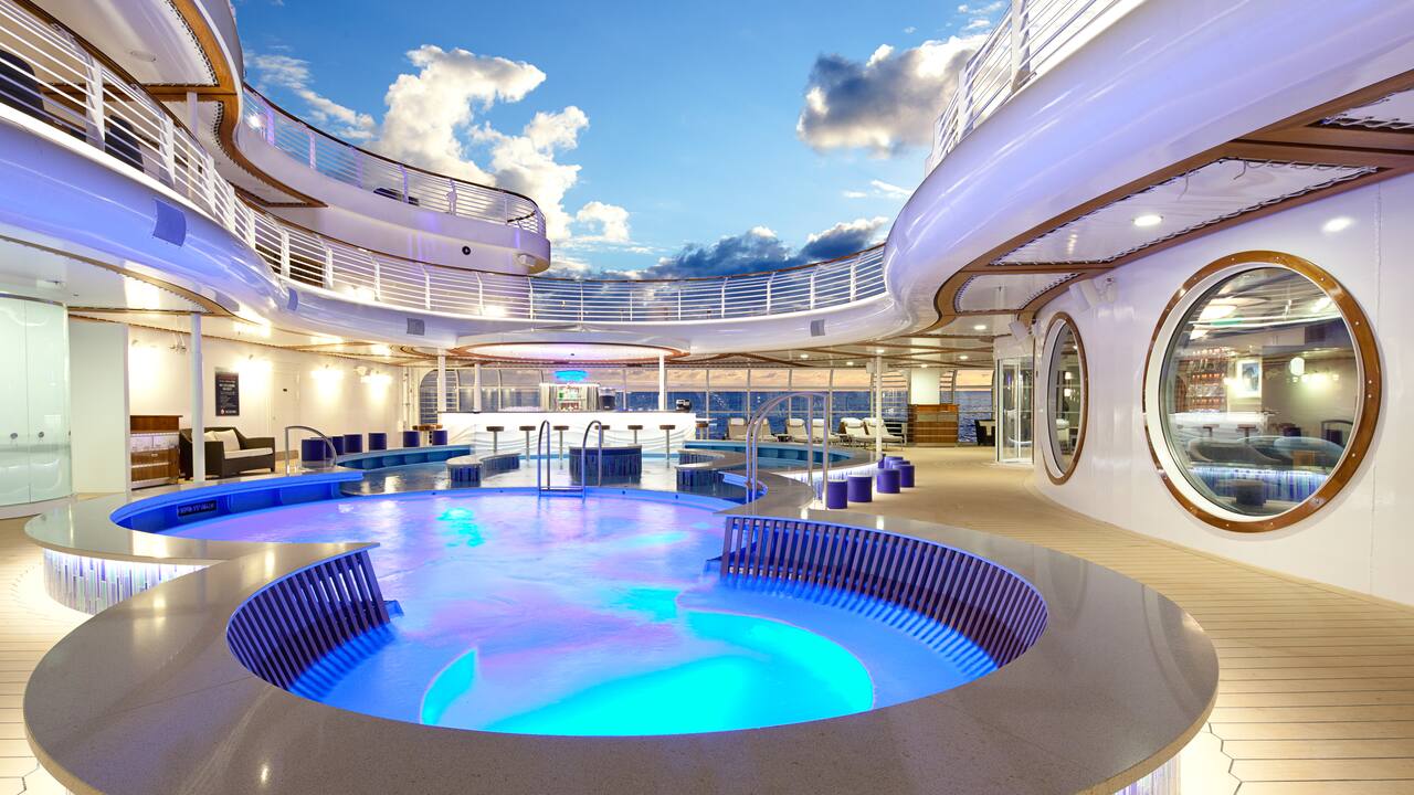 Pegue uma onda de relaxamento neste bar ao ar livre no alto do Deck 13. Oferecendo vistas impressionantes do mar, da costa e do pôr do sol, este local arejado é o lugar perfeito para saborear um coquetel ou bebida e simplesmente absorver tudo.