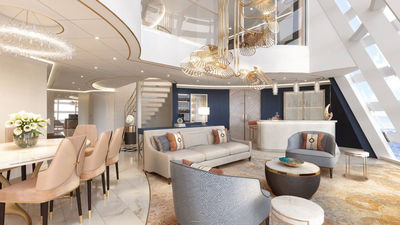 Esta acomodação inédita, situada no alto do funil acima dos decks superiores, apresenta uma decoração inspirada no filme Moana. Entre por uma entrada privativa especial e relaxe na sala de estar de pé-direito duplo, que apresenta um lustre espetacular e janelas de vidro do chão ao teto - ideal para apreciar a vista deslumbrante do oceano.