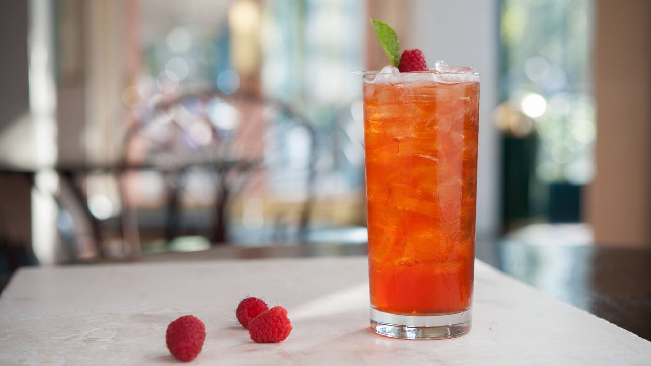 Chá de pêssego com bourbon Bonfamilies: Bourbon Woodford Reserve e aguardente de pêssego Bols com chá adocicado fresquinho