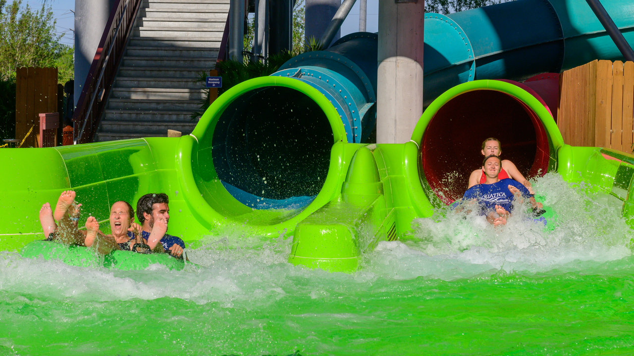Partindo do topo da torre de 20 metros de altura, os visitantes ficam a postos com suas boias para duas pessoas em duas pistas de corrida lado a lado. A corrida emocionante é completa por túneis em alta velocidade, voltas e giros. Quem irá percorrer a linha de chegada e sentir a emoção da vitória?