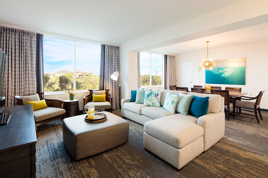 Esta suíte luxuosa oferece um quarto grande, sala de jantar e sala de estar, bar molhado e dois banheiros para criar seu próprio refúgio na ilha.