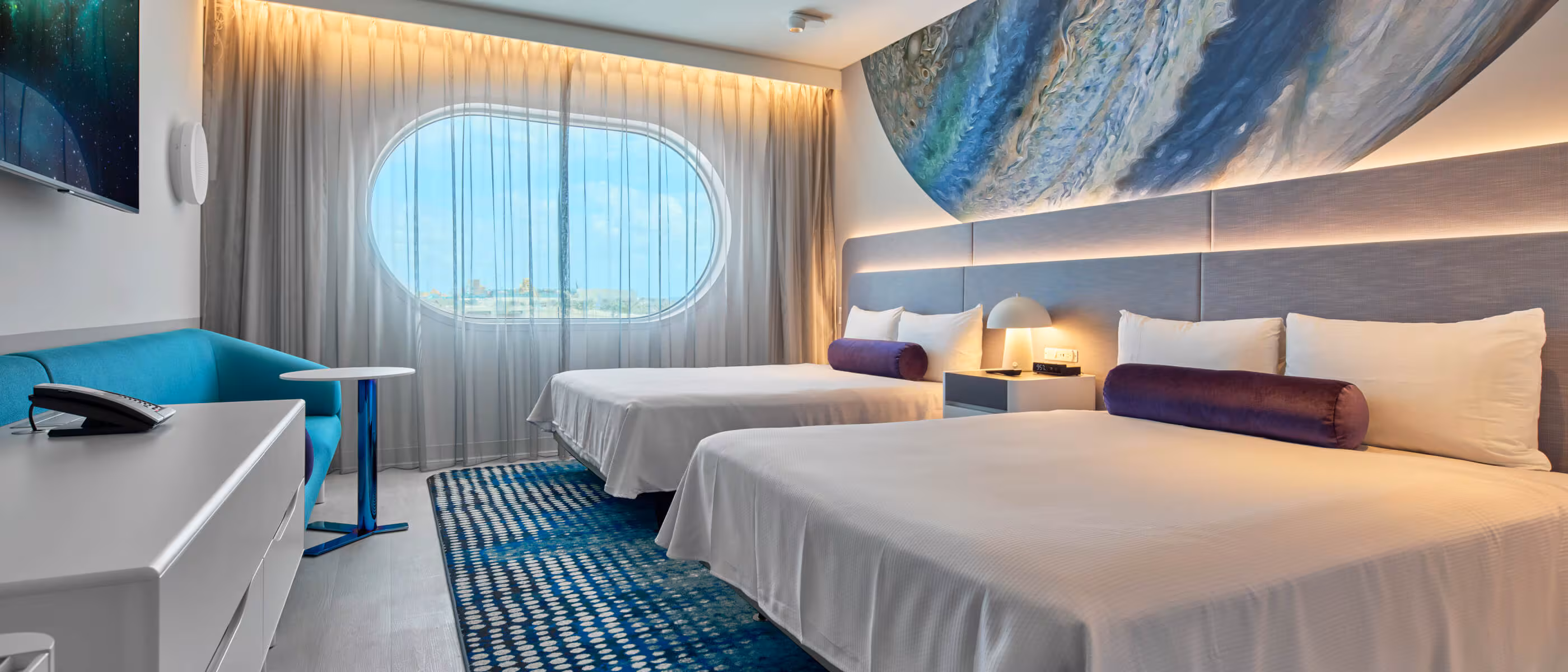 As acomodações no Universal Terra Luna Resort inspiram pensamentos de explorar novos mundos em um curso inexplorado.